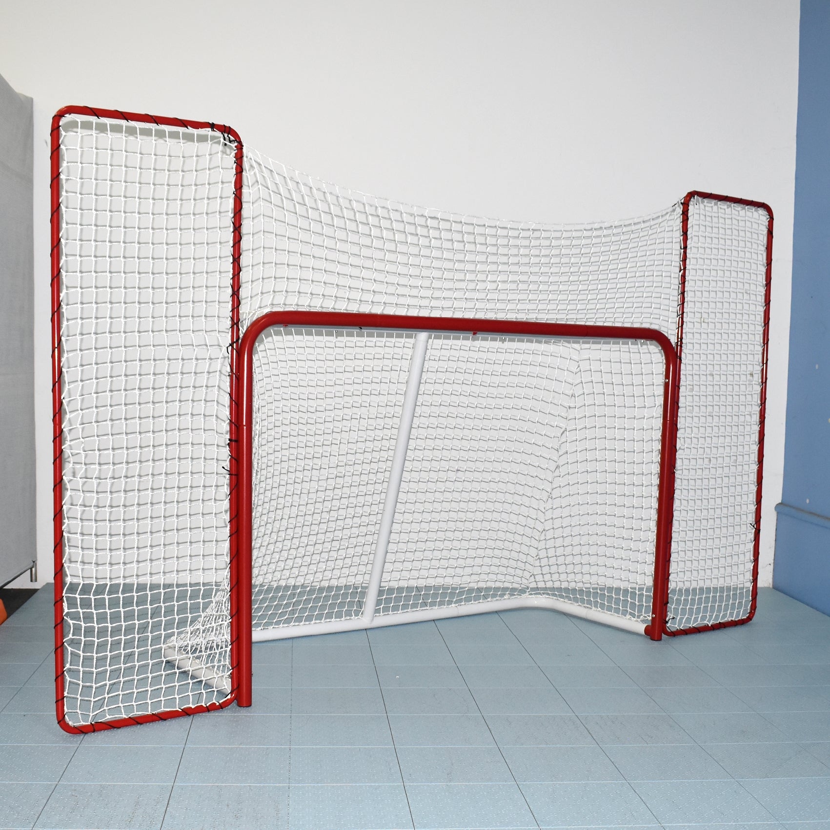 - Includes two backstops that attach to the hockey goals and a top backstop net - the backstop measures at 2' x 6'